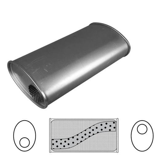 Universal muffler200mm (8”) x 100mm (4”) Oval, 400mm (16”) Long, 2 x 051mm Twin in / Twin out (2”) pipework Baffled Mild Steel