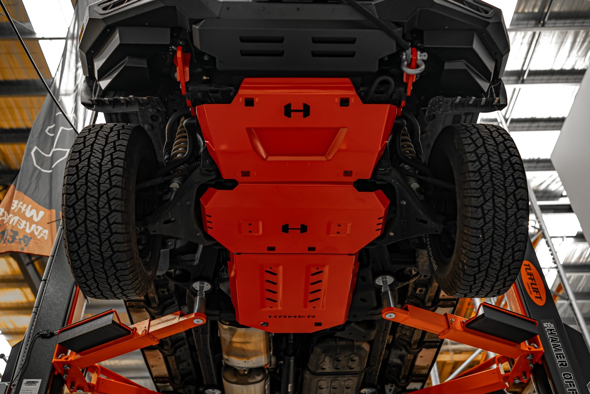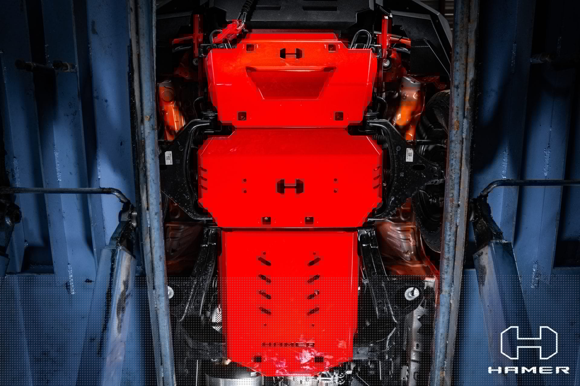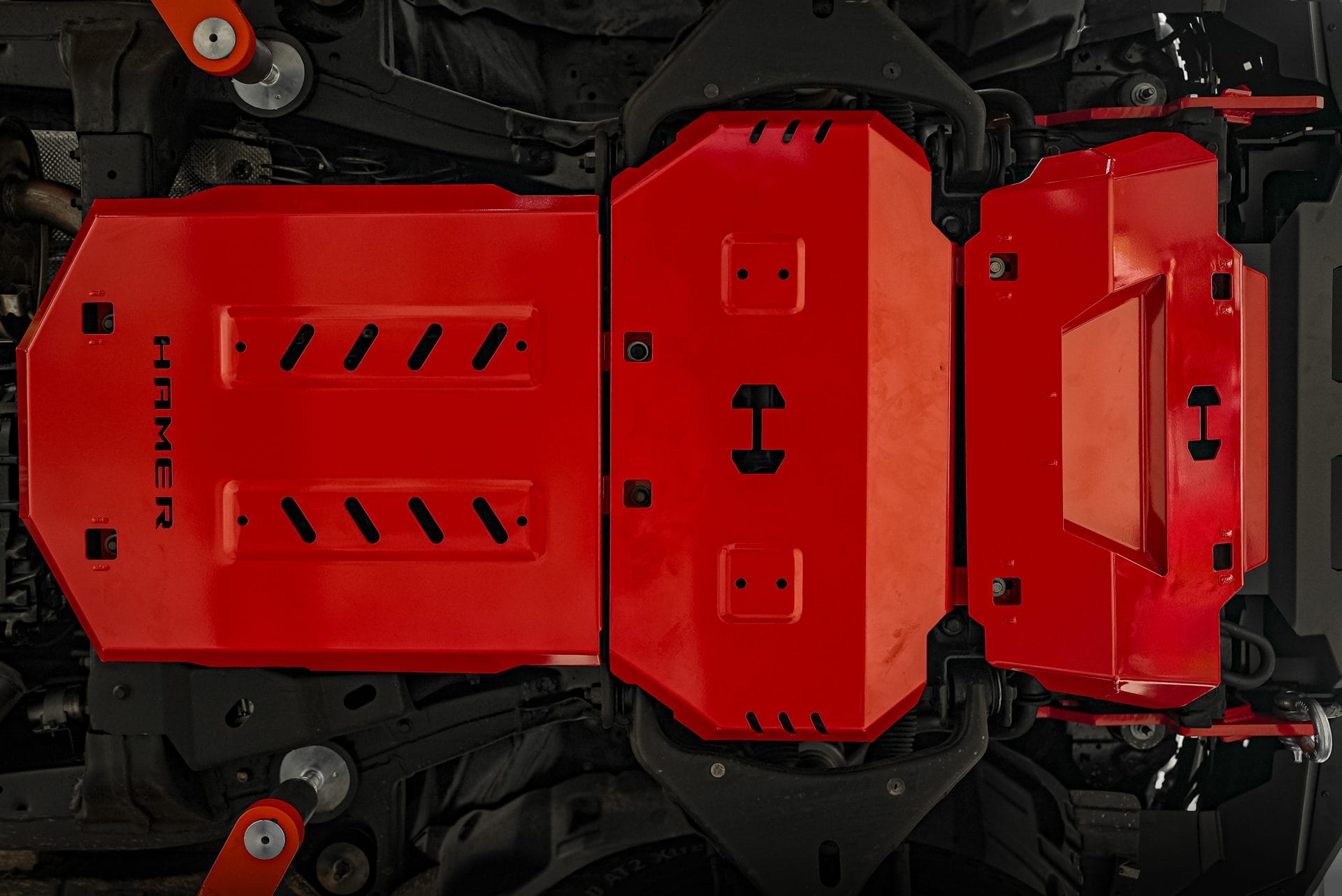 - Engine sump protection plate (red powder-coated steel, 3 mm)