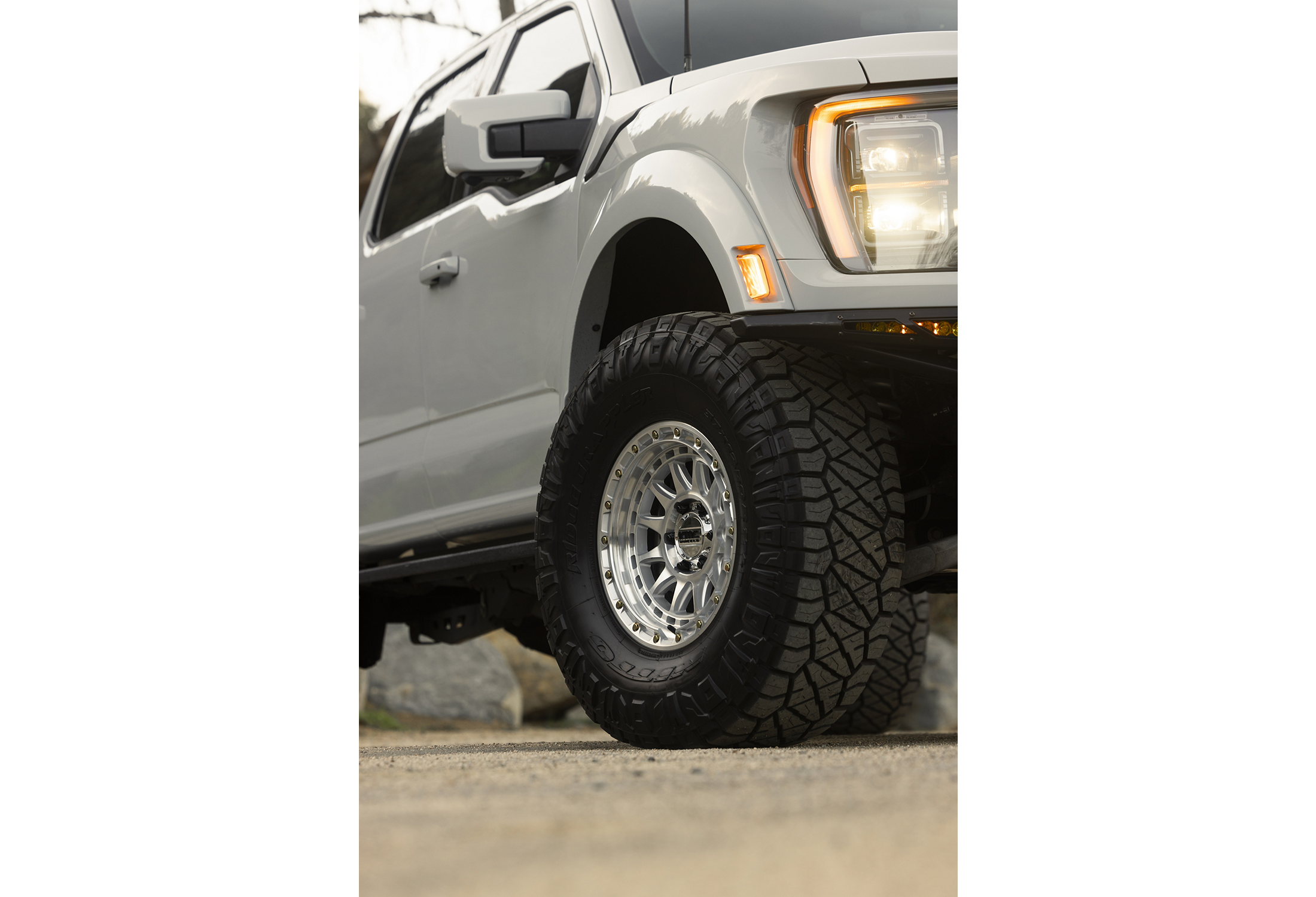 Aggressive 12-spoke design with detailed terrain-inspired windows and rock-retainer ring for enhanced off-road character.